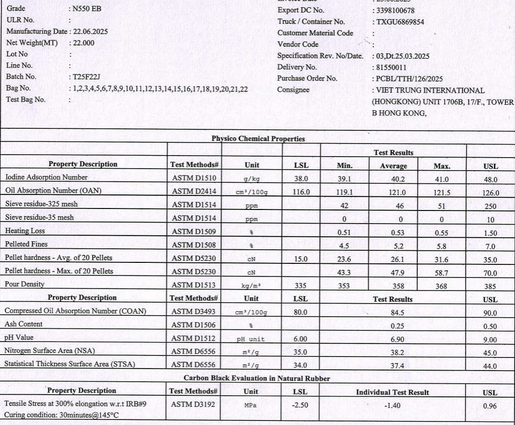 Carbon Black (than đen) N550 PHILLIPS PCBL của Ấn Độ là một trong những loại carbon black phổ biến và được đánh giá cao trong ngành sản xuất cao su kỹ thuật, nhờ sự cân bằng tốt giữa tính gia cường, khả năng phân tán và hiệu suất xử lý. Sản phẩm này được sản xuất bởi PHILLIPS Carbon Black Limited (PCBL) – nhà sản xuất carbon black hàng đầu Ấn Độ, đáp ứng tiêu chuẩn quốc tế và được ứng dụng rộng rãi trong các sản phẩm cao su như lốp xe, ống cao su, gioăng, dây curoa và nhiều chi tiết kỹ thuật khác.